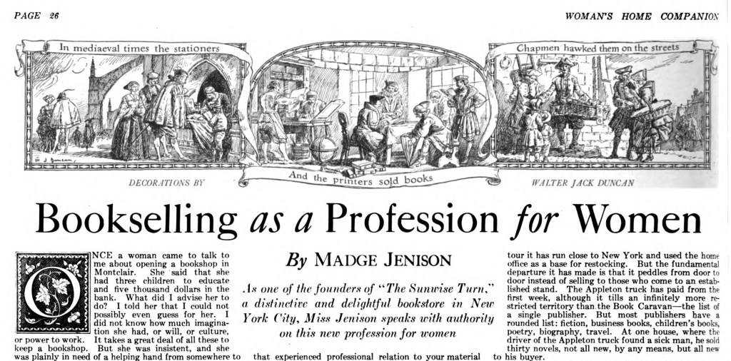 Jenison’s work as a member and president of the Women’s National Book Association put her in the position to directly advise other women booksellers and those interested in opening shops. Her 1923 bookselling memoir make have been inspired by the obvious interest in the subject.